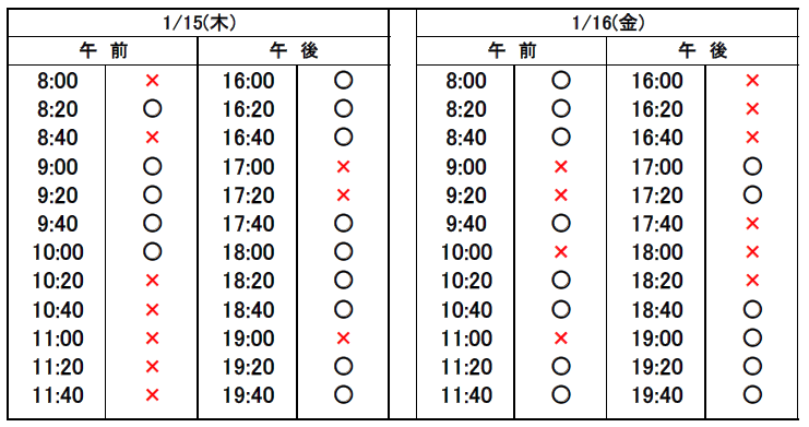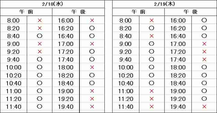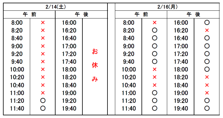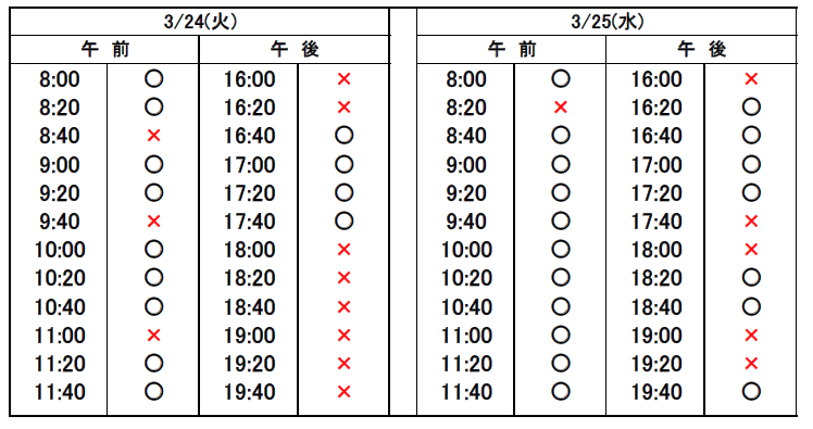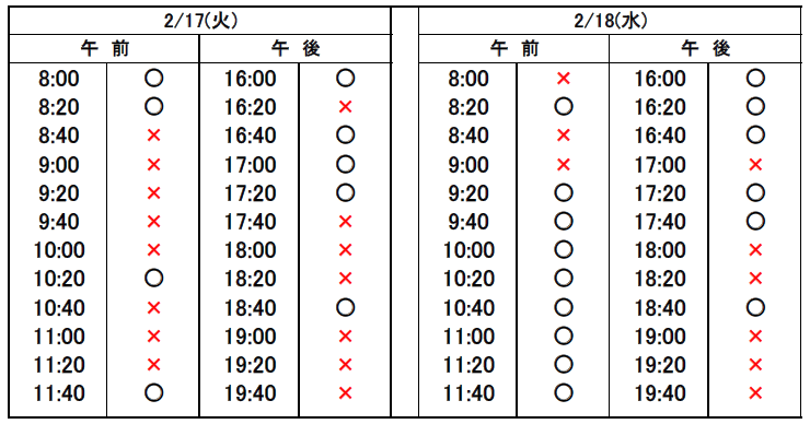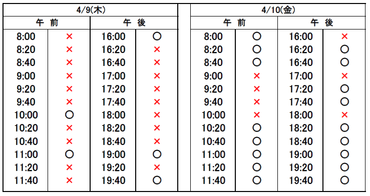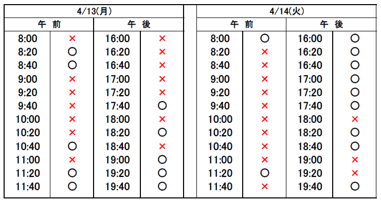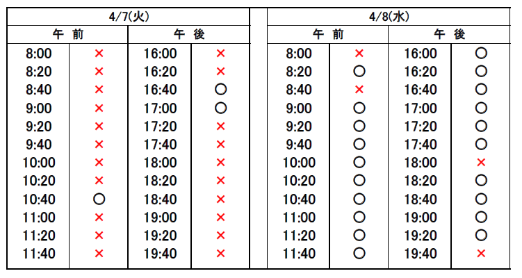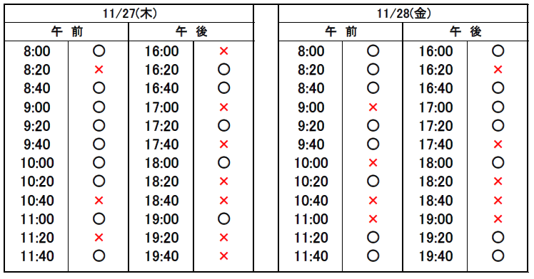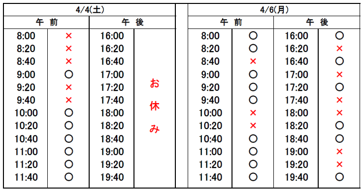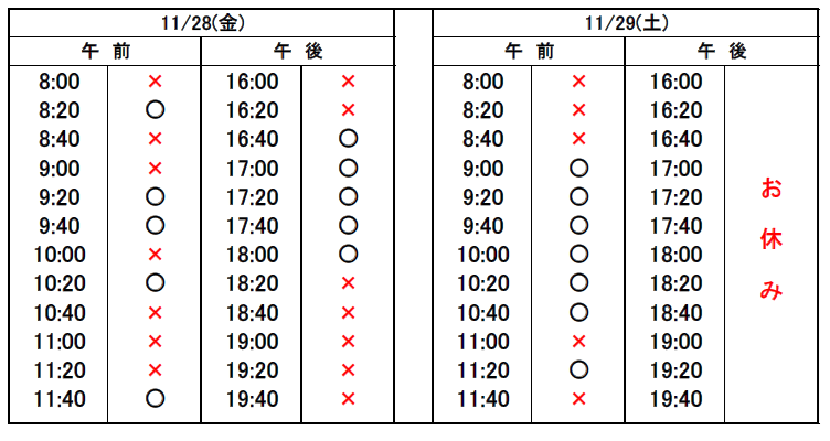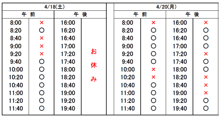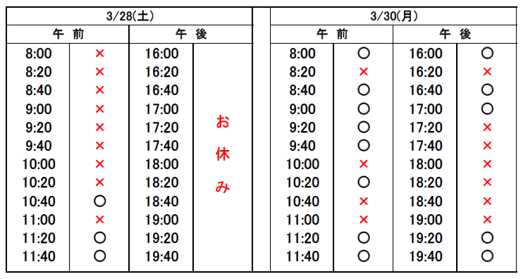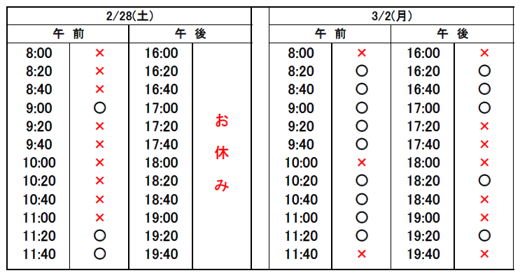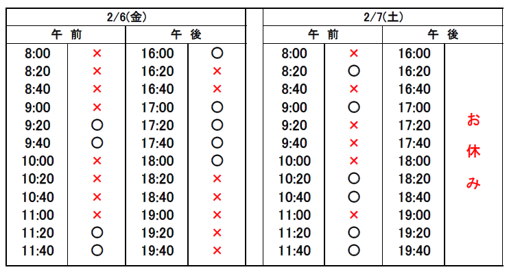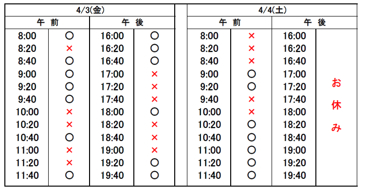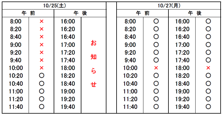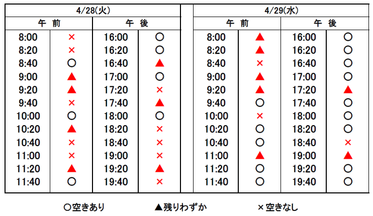 ※当日予約の場合、予約表では「×」になっていても、急なキャンセルや時間変更があった場合、予約が空いていることがありますので、お電話でお問合せください。