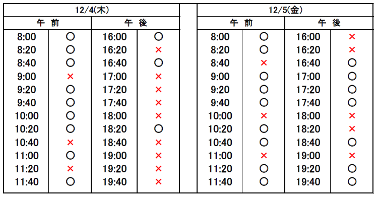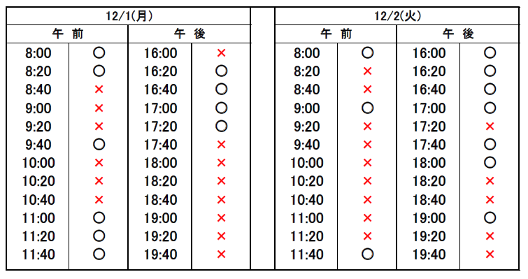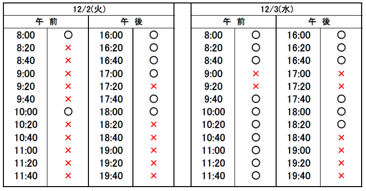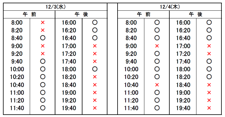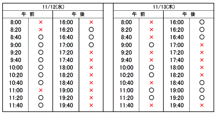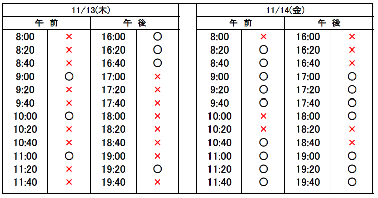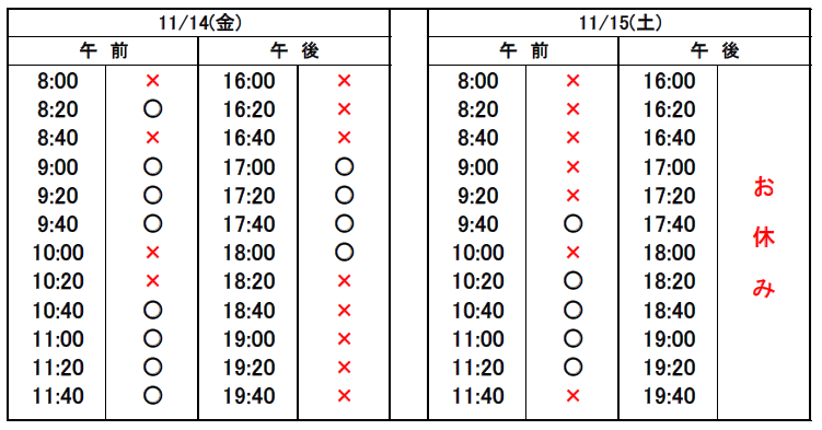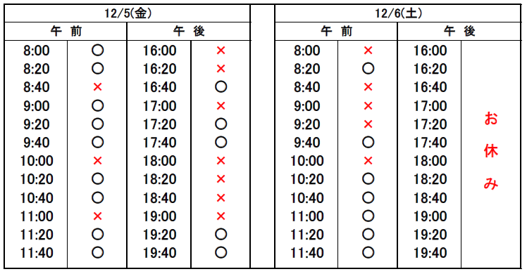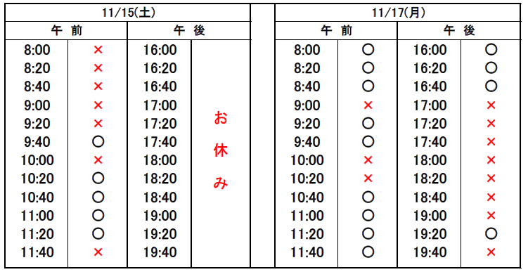 ※当日予約の場合、予約表では「×」になっていても、急なキャンセルや時間変更があった場合、予約が空いていることがありますので、お電話でお問合せください。