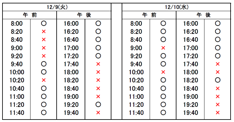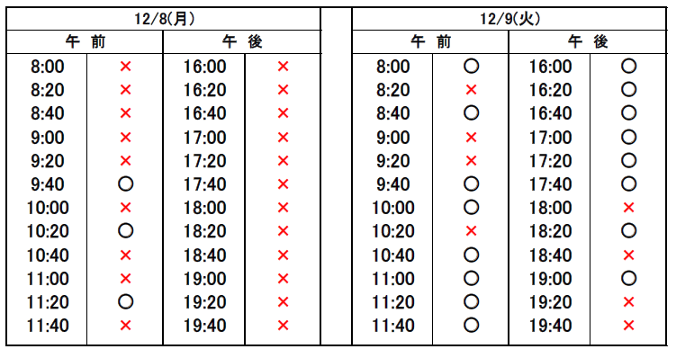 ※当日予約の場合、予約表では「×」になっていても、急なキャンセルや時間変更があった場合、予約が空いていることがありますので、お電話でお問合せください。