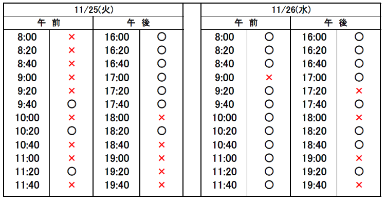 ※当日予約の場合、予約表では「×」になっていても、急なキャンセルや時間変更があった場合、予約が空いていることがありますので、お電話でお問合せください。