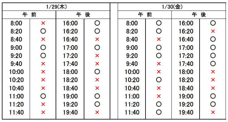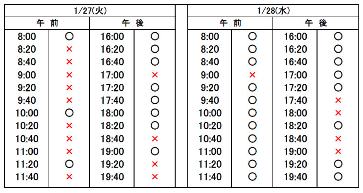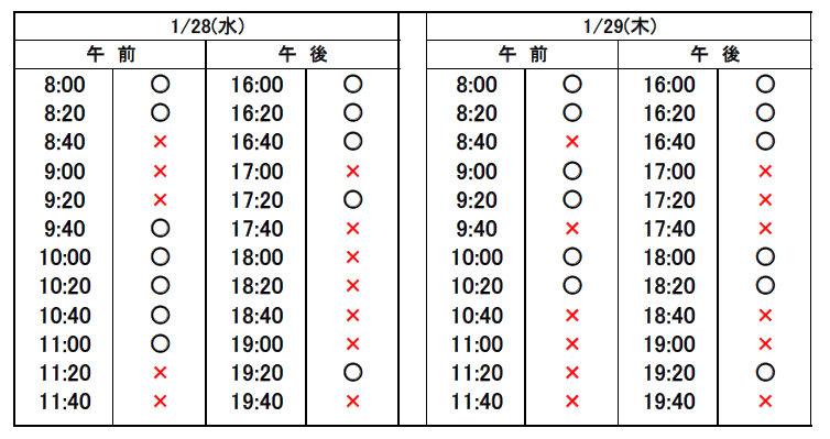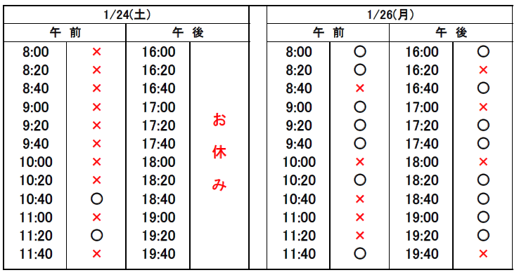 ※当日予約の場合、予約表では「×」になっていても、急なキャンセルや時間変更があった場合、予約が空いていることがありますので、お電話でお問合せください。