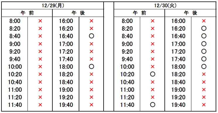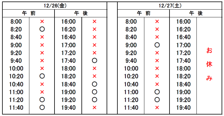 ※当日予約の場合、予約表では「×」になっていても、急なキャンセルや時間変更があった場合、予約が空いていることがありますので、お電話でお問合せください。