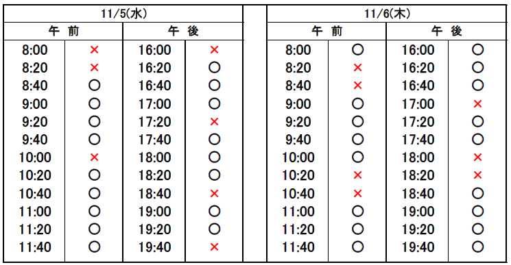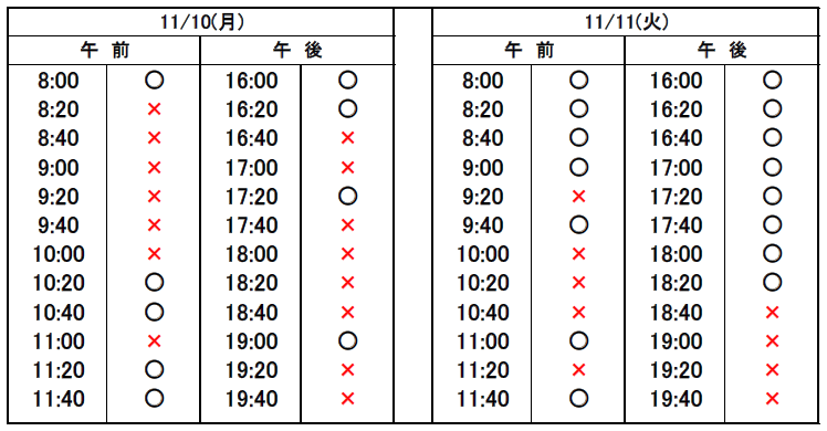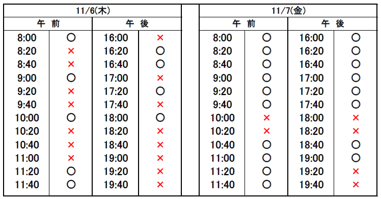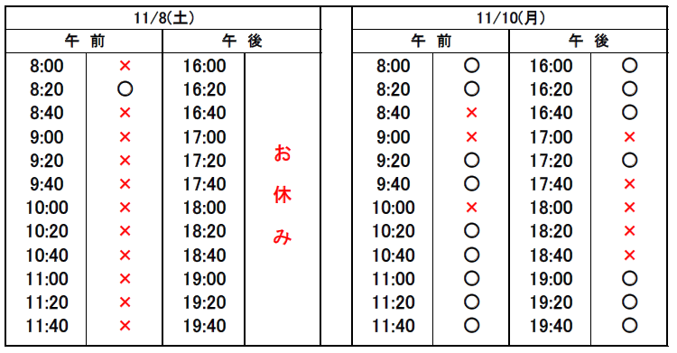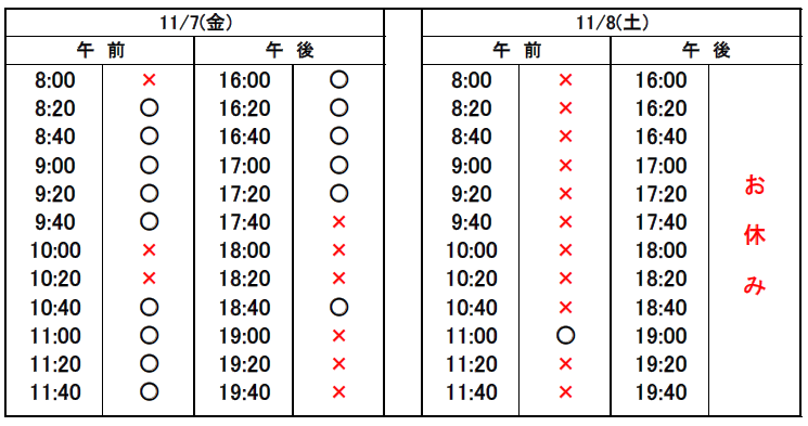 ※当日予約の場合、予約表では「×」になっていても、急なキャンセルや時間変更があった場合、予約が空いていることがありますので、お電話でお問合せください。