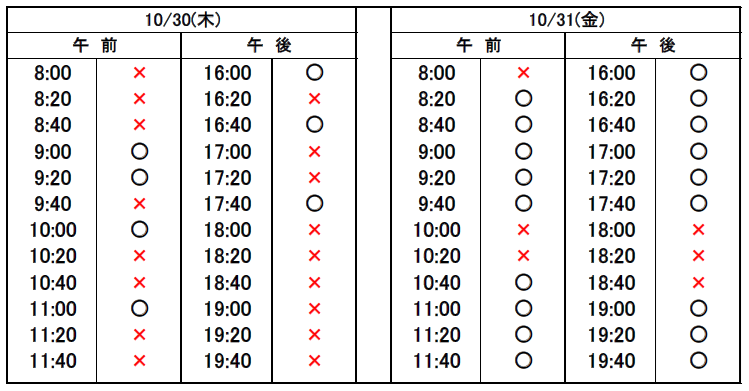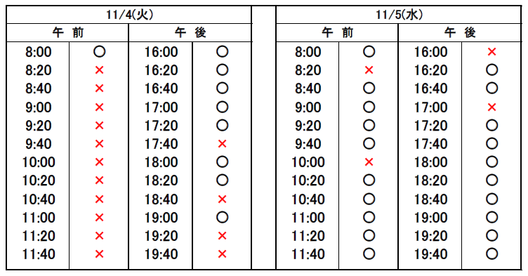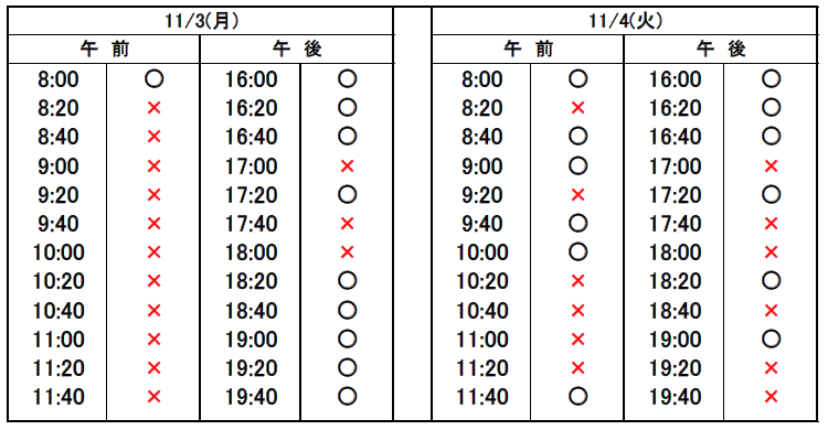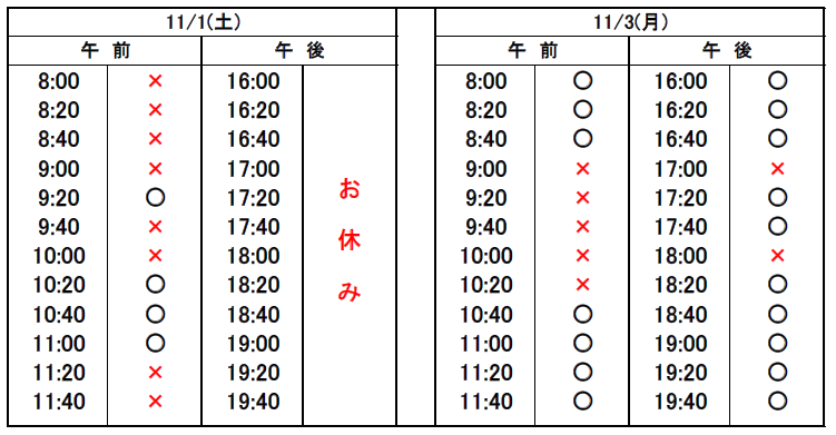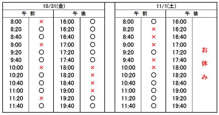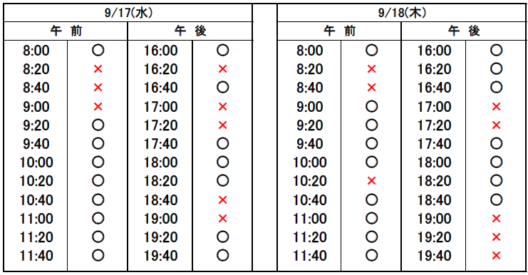 ※当日予約の場合、予約表では「×」になっていても、急なキャンセルや時間変更があった場合、予約が空いていることがありますので、お電話でお問合せください。